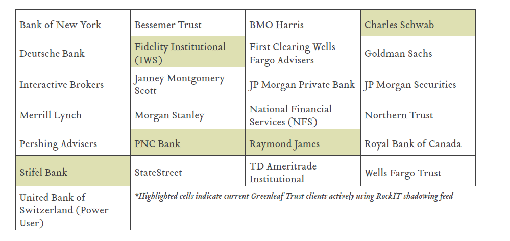 Delaware’s directed statute allows almost all discretionary duties, traditionally the responsibility of the trustee, to be handled by an adviser, which is appointed in the trust or by the grantor, trust protector or committee. Those duties include distributions as well as investments. By appointing a distribution adviser to direct distributions, someone other than the corporate trustee decides when to make distribu-tions to beneficiaries. This may be important to the grantor since they may feel more comfortable appointing an adviser who has extensive and intimate knowledge of each beneficiary’s situation, and may rely on that knowledge when directing distributions in accordance with the terms of the trust. An investment adviser will have the power to direct the trustee for investment management and decisions, decide who manages assets of the trust and whether to hold a concentrated position in the trust. This may be particularly comforting to a grantor who has funded a trust with a closely held business, since there will be less concern with the corporate trustee deciding to sell the business in order to diversify the assets of the trust. The investment adviser can also hire agents to assist with the investment of trust assets. This includes third-party registered agents and/or financial managers. Greenleaf Trust has direct custodian feeds with the following: